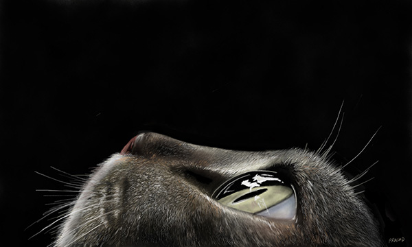 This captivating digital painting presents a close-up view of a grey kitten, its head tilted upwards in a posture of curiosity or perhaps wonder. The kitten's fur is rendered in light to dark shades of grey, creating a sense of depth and texture. Its large round eyes captures innocence.