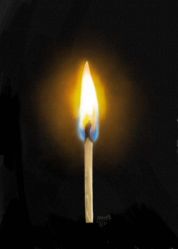 A digital painting of a lit matchstick emphasizing the overall effect of both fragility and power, a small but potent source of light in the darkness.