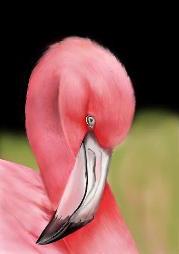 This intimate portrait captures the vibrant pink plumage rendered with exquisite detail, showcasing the subtle variations in hue and texture. The bird's long, graceful neck curves elegantly, culminating in a sharp, pointed beak.