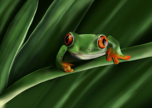 Digital Painting captures the emerald green skin and striking red eyes of tree frog perched on a lush, tropical leaf. The painting showcases the frogs' unique webbed feet and sticky toe pads. The backdrop of rainforest adds to the overall sense of wonder and natural beauty.